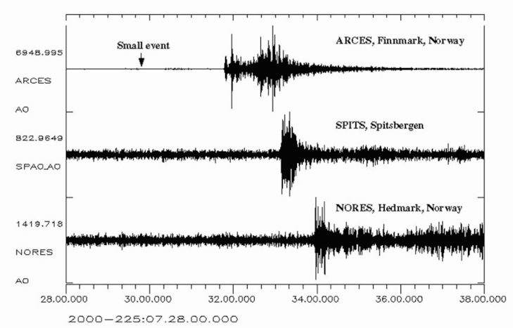 Σύμφωνα με την επίσημη ανακοίνωση, αλλά και την καταγραφή σεισμογραφικών ινστιτούτων, έλαβαν χώρα δύο συμβάντα, σε συντεταγμένες Ν69ο38’ Ε37ο19’ το πρωί της 12ης Αυγούστου 2000. Το πρώτο σημειώθηκε στις 11:29:34 (ώρα Μόσχας) και ήταν ανάλογο σεισμού εντάσεως 1,5 βαθμών της κλίμακας Richter και το δεύτερο, το οποίο ήταν σίγουρα έκρηξη, 2 λεπτά αργότερα, ανάλογο σεισμού 3,5 Richter. Στα δύο λεπτά που μεσολάβησαν καταγράφηκαν ηχητικά σήματα που αντιστοιχούν είτε στο απότομο άδειασμα των δεξαμενών έρματος με σκοπό την ταχεία ανάδυση, είτε σε απότομη επιτάχυνση, είτε σε συνδυασμό των δύο. Είναι λοιπόν σαφές ότι το πρώτο συμβάν στις 11:29 ανάγκασε το σκάφος να εκτελέσει κινήσεις εκτάκτου ανάγκης, ενώ το δεύτερο συμβάν είναι προφανώς η έκρηξη των τορπιλών στο πρόσθιο διαμέρισμα, η οποία αποτελείωσε το σκάφος.