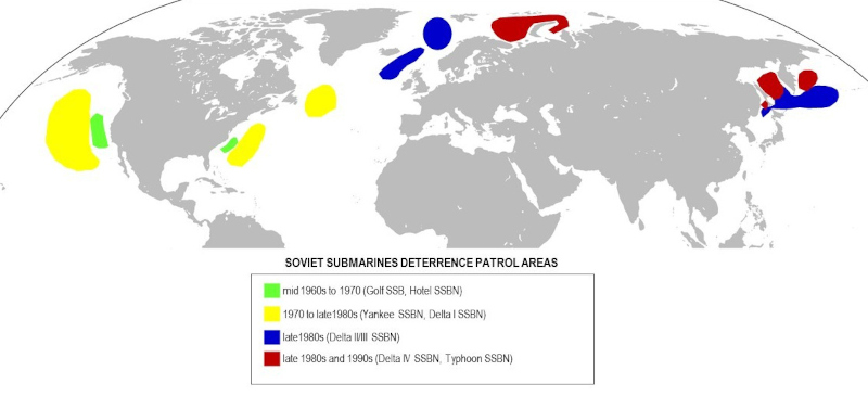 On the other hand, the Soviet Navy usually had only 10-15% of the SSBNs on patrol. Their patrols usually did not last more than 60 days. In the mid-1990s, US intelligence released maps showing Soviet SSBN patrol areas. It has not been clarified whether these are actual data or estimates.