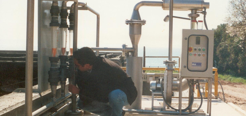 Ozone-wastewater contact system: The contact system consists of a three-chamber tank, height of 4,5-5m with inside splits that guide the wastewater to a vertical labyrinthine flow. Ozone is supplied to the tanks through diffusers made of a special porous material of high resistance. These diffusers have the ability to create multi-numbered and very thin ozone bubbles, with a diameter of 220μm. With their appropriate geometric installation in the bottom of the contact tank, better distribution but also increase in the liquid-gas contact surface to its maximum, is achieved.